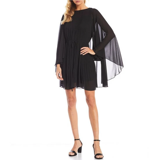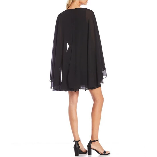 Flash Sale ⌛ Alex Marie Petite Size Jordan Round Neck Long Cape Sleeve A-Line Chiffon 👗 Dress Black 🥰
